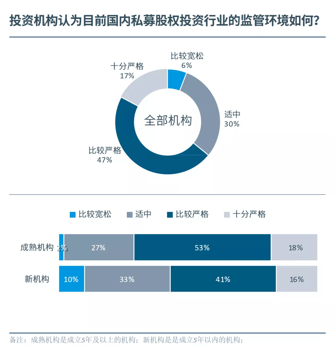 64%投資機構(gòu)認為國內(nèi)當(dāng)前私募股權(quán)投資行業(yè)監(jiān)管嚴格(含“比較嚴格”和“十分嚴格”)。成熟機構(gòu)認為“監(jiān)管嚴格”的比例遠高于新機構(gòu),主要原因可能是2014年以來中國創(chuàng)新經(jīng)濟加速發(fā)展,市場層出不窮的模式和現(xiàn)象倒逼管理層加碼監(jiān)管,致使當(dāng)下的監(jiān)管環(huán)境與成熟機構(gòu)前期經(jīng)歷的“相對寬松”環(huán)境出現(xiàn)明顯反差。