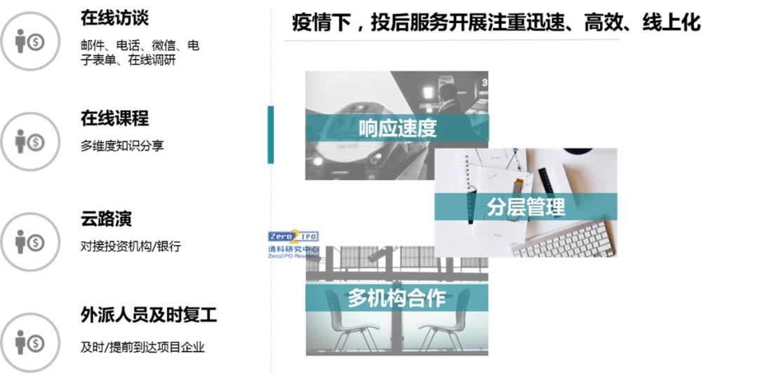 在嚴格的物理隔離之下,機構投后服務開展注重高效化、線上化。通過在線訪談、電子表單等形式收集被投企業信息;通過線上課程解答眾多創業企業需要面對的共性問題;原本線下進行的資源對接會、路演也轉為了“云路演”,為企業高效對接資源。針對有外派人員的并購類、工程類項目,外派人員及時甚至提前到崗,加快企業安全復工復產。