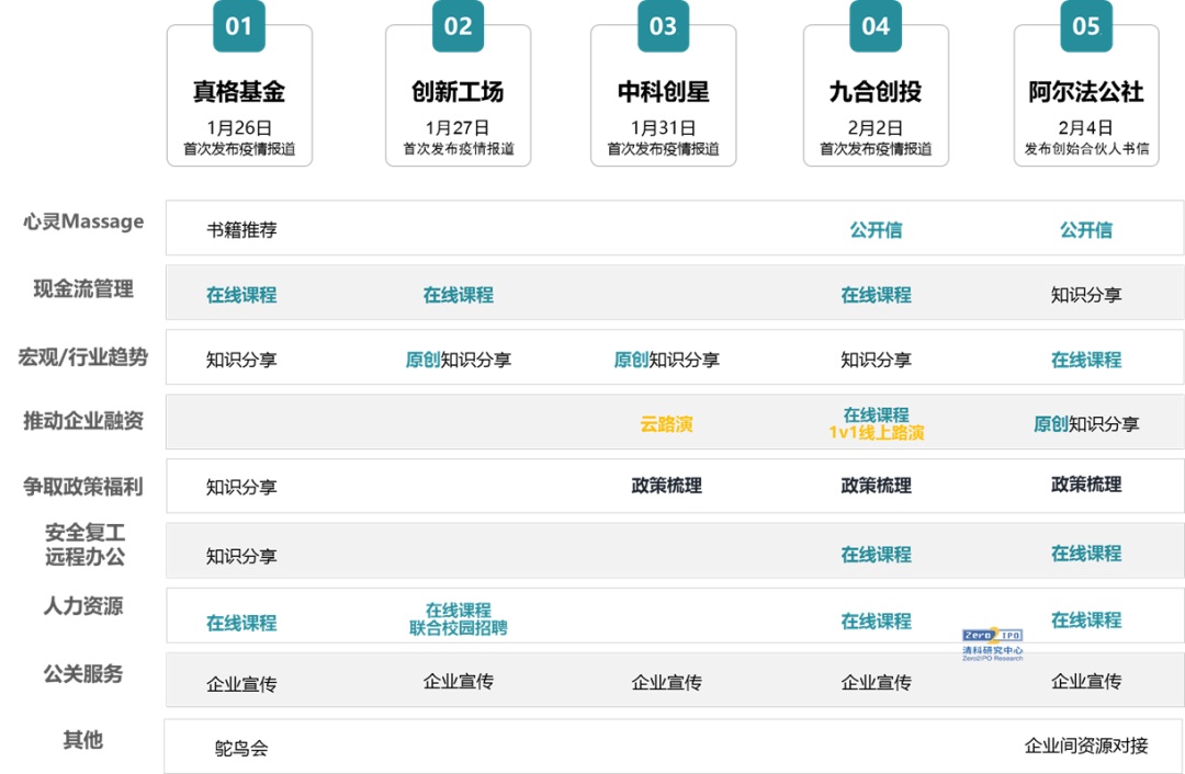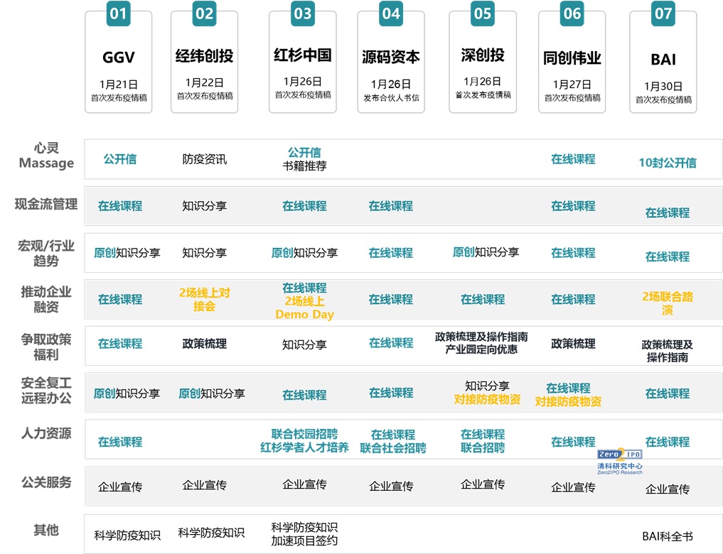VC機構是投后服務體系較為健全的一類。面對突發狀況,VC機構投后服務啟動迅速,例如1月26日,紅杉中國即發布了《紅杉中國給成員企業的一封信》,發出對被投企業的三個提醒。紅杉、源碼資本、GGV等機構均迅速開展了系列課程,涵蓋遠程辦公協作、勞動法規培訓、疫情時期的融資策略、疫情期間的財務風險管理以及疫情時期的人力資源優化等方面。紅杉、經緯、BAI率先嘗試了線上路演形式;紅杉、深創投、源碼資本幫助企業解決春招難題。