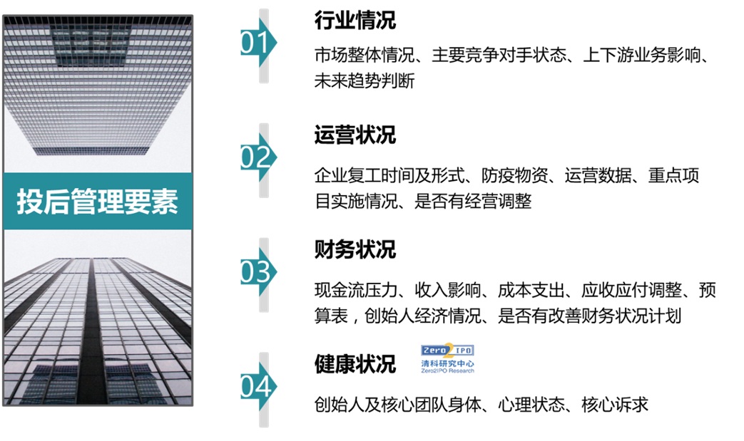 全球性黑天鵝事件爆發,企業經營管理和抗風險能力正面臨極大考驗,機構在這一特殊時期,需要持續對被投企業運營狀況、財務狀況進行跟蹤。了解企業復工安排、重點項目進展情況、關懷創始人的身心健康,隨時關注和掌握被投企業的痛點和訴求。同時,根據企業反饋情況和數據,重新評估被投企業,出具風險提示文件、制定風險控制策略。在企業面臨困境時,高頻跟蹤和深入溝通是投資機構及時解決企業困難、把控項目風險的最佳方案。